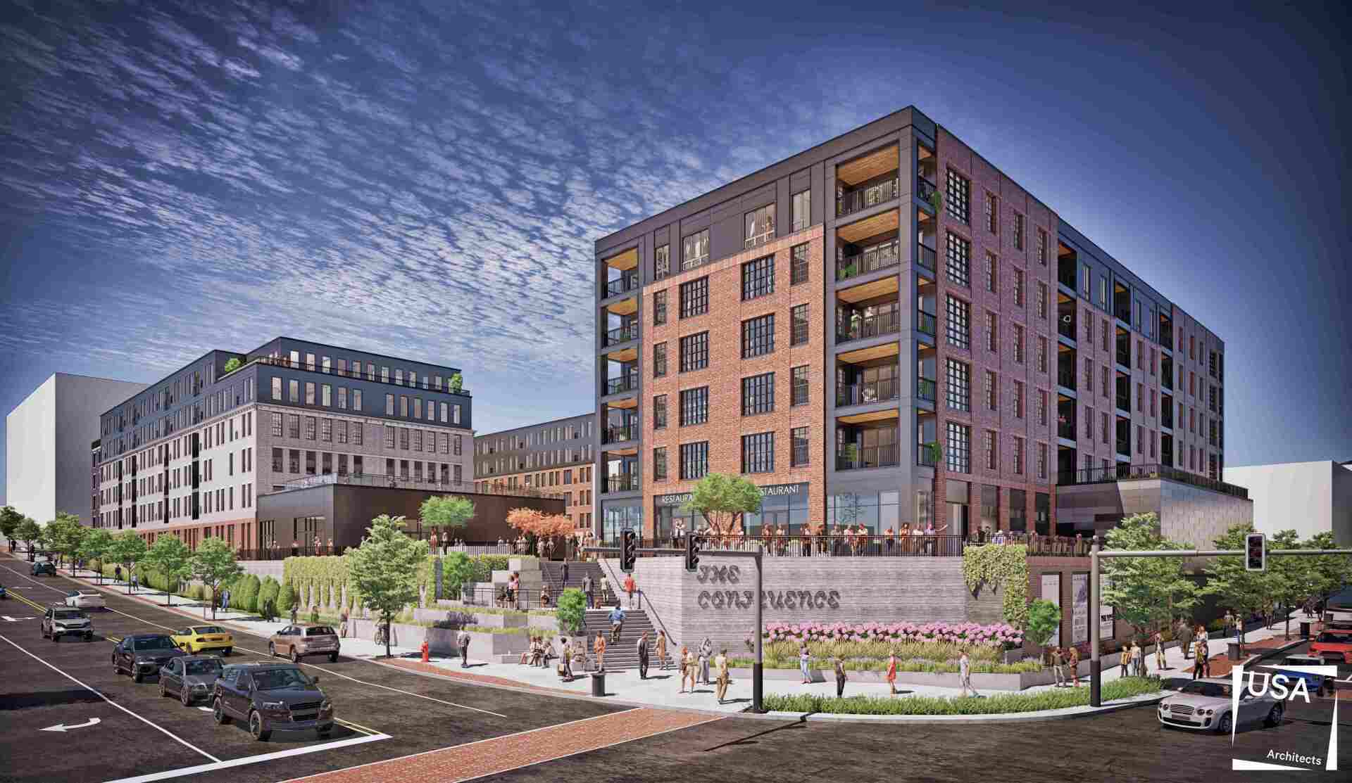 Peron Development is developing the old Days Inn lot at the corner of South 3rd Street and Larry Holmes Drive in downtown Easton. The project, named Confluence, is a large mixed use building. The 474,825-square-foot mixed-use development will be built at 185 S. Third St., Easton, PA. The building will feature 212 one- and two-bedroom apartments; 42 two- and three-bedroom condominiums, and 16,000 square feet of retail space that will include a restaurant, artist studios, and cinema space that can be used for live performances and other events. There is also a two level enclosed parking garage and interior courtyard.
